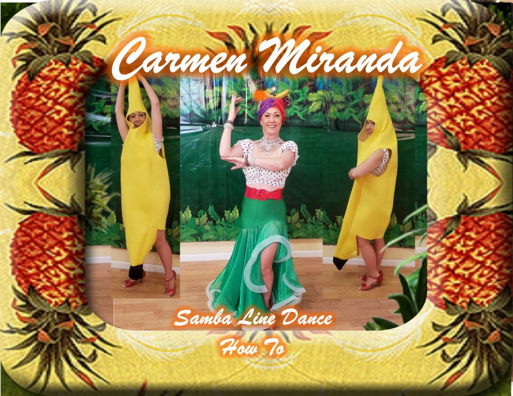 Exploding onto the big screen with Chicca Chicca Boom Chick, Carmen opened the film “That Night in Rio.” This was an over-the-top war time Fox musical featuring big cast, elaborate costumes, and exotic musical numbers. The opening number Chicca Chicca Boom Chick is the inspiration for my Carmen Miranda Chicca Chicca Boom Chick Samba Line Dance How To.