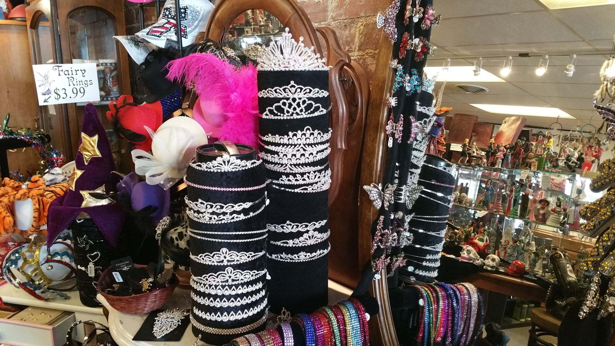 (Holly –>) What’s the best tip you have for a couple planning a wedding? (Barb –>) I think to make it really really different so that it’s really memorable for not only you but your guests, and family, and everybody else. I just think you should make it different, step out of the box. (Holly –>) You’re a great place for stepping out of the box here at Grandpa’s Attic, what kind of unusual wedding things do you have around the store? (Barb –>) Well we do have typical things, we have tiaras which a lot of brides wear. We have very fancy Mardi Gras masks which we provided for a Mardi Gras reception where all of the reception people had masks on, so we sold these really fancy masks for that. The wedding toppers especially Halloween wedding themed but we sell those all year round. I guess that day of the dead is very popular right now. (Holly –>) and then you had dragon toasting glasses. (Barb –>) We did have a guy come in that bought the dragon mugs for his groom’s men so that at the reception they could all toast with the dragon mugs. So that was fun, he bought like 11 of them, he had 11 grooms men and they all had their mugs. (Holly –>) You also had dragon heart toppers and you were saying those could be customized. (Barb –>) Yes you can paint those they are poly resin and they can be painted to match your colors, they’re pink and blue now but they can be any color you want them to be. (Holly –>) And then you have rubber ducky wedding parties (Barb –>) yes we do, we carry the whole wedding party in rubber ducks and we have the bride and the groom, and the brides maids and the grooms men, and even a little bitty ring bearer and flower girl. (Holly –>) So you can find all kinds of useful accessories for your wedding you were telling me about all of your tiara’s and your bling accessories are typically quite a bit less expensive than at a regular wedding store so this is a great resource for your Rhine stone necklaces and Rhine stone accessories, your hair pieces, your Rhine stone masks so that you have these great deals here as well as other eclectic wedding.