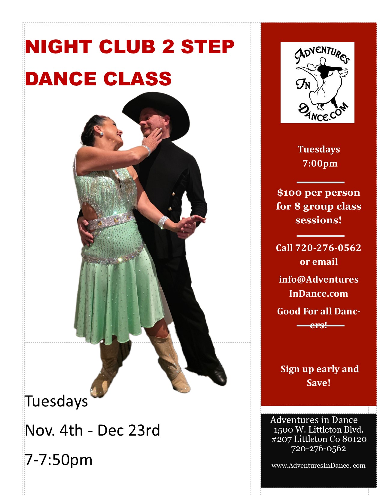 Beginner & intermediate dancers have fun learning Night Club 2 Step found at Colorado dance clubs.