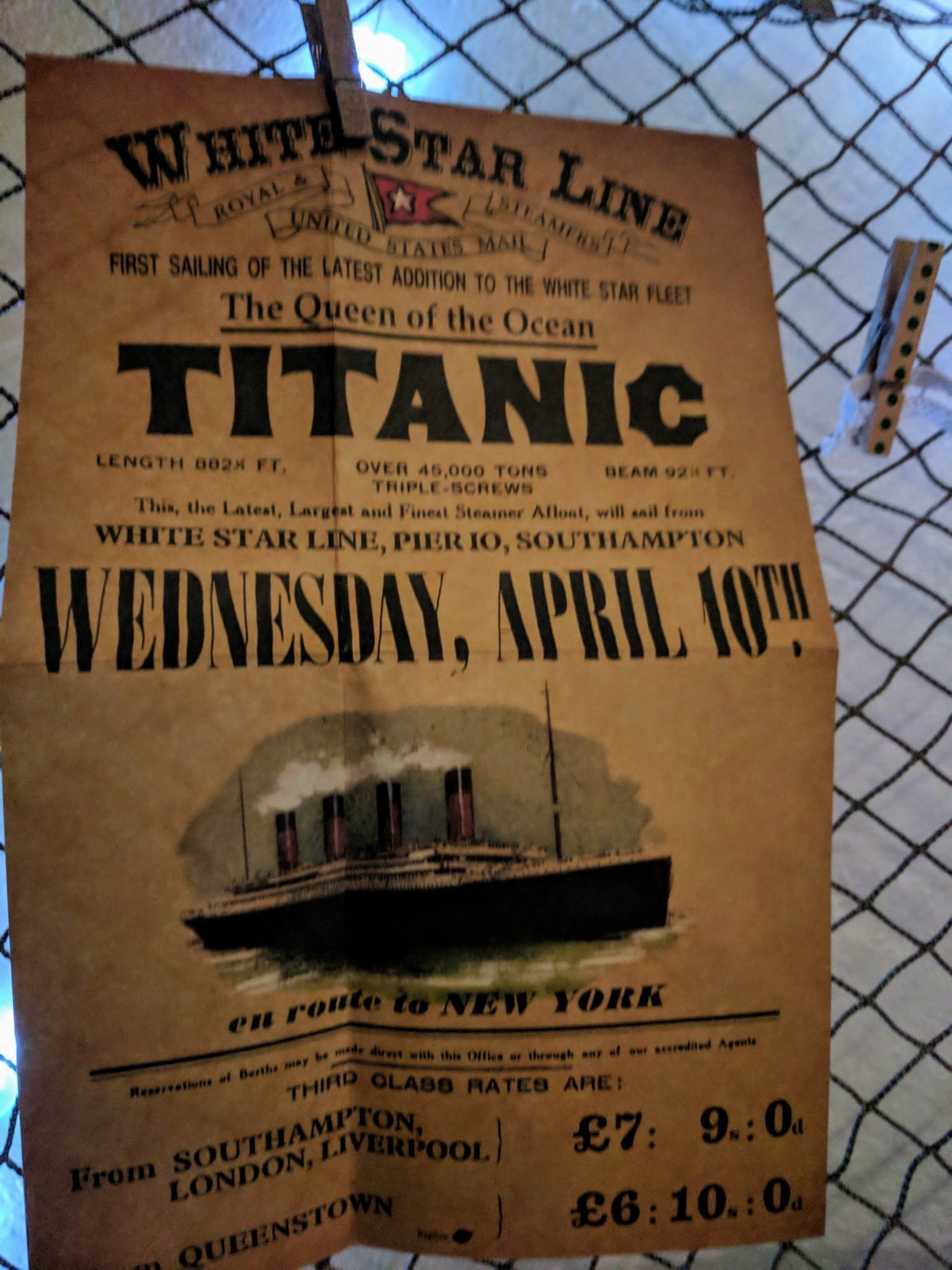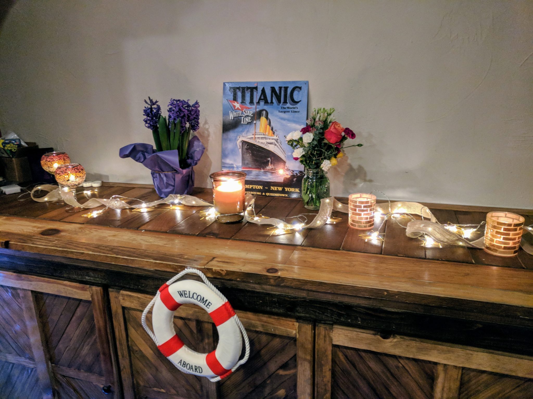 Titanic decorations were distributed about the dining area. During cocktail hour we played Titanic themed music. Guests were entertained with a Titanic themed photo booth with all the fun props to make the picture pop.