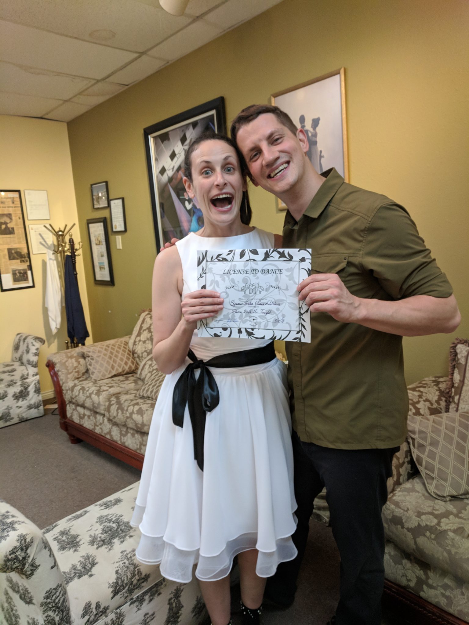 Swing is an upbeat choice for a first dance. Cara Edelstein and Spencer Hinton chose to rock their reception with a swing to “Dance with me tonight” by ollie Muurs. Kara went so far as to purchase a vintage reception dress and add special laces to her vans for her first dance. They practiced for 9 months and added in extra social dances like rumba, cha cha, and merengue. When the big day came on September 23 2019 at the Moss reception hall they nailed every move. After the honeymoon they came back to work on Foxtrot. They look forward to a lifetime of dance and romance.